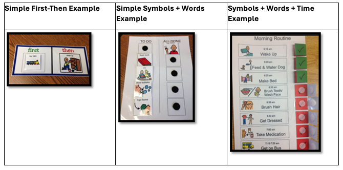 - Teach: Use timers and verbal/physical prompts (cues), especially when the schedule is new.